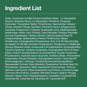 - جميع المكونات: ماء, ماء زهرة/ورقة/ساق هوتوينيا كورداتا, جلسرين, بوتيلين جليكول, بانثينول, 2,3-بيوتانيديول, كربونات ثنائي الكابريليل, ميثيل تريميثيكون, نياسيناميد, 1,2-هيكسانيديول, بنتيلين جليكول, سكوالان, سيتيريل أوليفات, سوربيتان أوليفات, سوربيتول, ثنائي فينيل سيلوكسي فينيل تريميثيكون, بوليستيرات السكروز, بولي إيزوبوتين مهدرج, أكريلات ألكيل بولي C10-30, ستيريل ثنائي الميثيكون, سيتيل بالميتات, كحول سيتيريل, أكريلات/كروسبوليمر أكريلات ألكيل C10-30, ثنائي ستيرات بولي جليسريل-3, أكريلات هيدروكسي إيثيل/أكريلويل ثنائي ميثيل الصوديوم, كوبوليمر تورات, إسترات ديسيل زيت الزيتون المهدرج, بالميتات السوربيتان, أمينوميثيل بروبانديول, ستيرات الجلسرين, أكريلات الصوديوم/أكريلويل ثنائي ميثيل الصوديوم, كوبوليمر تورات, بولي إيزوبيوتين, بولي جليسريل-6 كابريلات, ليسيثين مهدرج, سليلوز, إيثيل هكسيل جليسرين, بولي جليسريل-4 كابرات, أدينوسين, كانديدا بومبيكولا/جلوكوز/ميثيل, تخمير بذور اللفت, زيت الزيتون (أوليا يوروبايا) غير قابل للتصبن, فيتات الصوديوم, سوربيتان إيزوستيرات, سترات ستيرات الجلسريل, بيتا سيتوستيرول, مستخلص أوراق ميليا أزاديراشتا, ألانتوين, مستخلص زهرة ميليا أزاديراشتا, كابريليل/كابريل غلوكوزيد, سوربيتان أوليات, حمض ماديكاسيك, مستخلص أوراق أوسيموم سانكتوم, أسياتيكوسيد, ماديكاسوسيد, زيت بذور المكاديميا تيرنيفوليا, فيتوسترولس, مستخلص جذر الكركم, حمض دهني, مستخلص كورالينا أوفيسيناليس, حمض آسيوي, توكوفيرول, سيراميد NP, كوليسترول, فيتوسفينجوزين, سيراميد NG, سيراميد NS, سيراميد AP, سيراميد AS, سيراميد Eop.