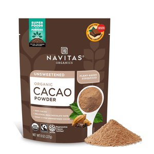 استمتع بتجربة الشوكولاتة الطبيعية الغنية مع مسحوق الكاكاو العضوي غير المحلى من Navitas Organics، وهو أحد أفضل منتجات السوبر فود النباتية المصنوعة من حبوب كاكاو عضوية نقية 100% يتم اختيارها بعناية ومعالجتها بأساليب تحافظ على قيمتها الغذائية الطبيعية. يتم تخمير الحبوب وتجفيفها وتحميصها بلطف دون استخدام المعالجة القلوية، مما يساعد على الحفاظ على الفلافانولات ومضادات الأكسدة والمعادن الطبيعية الموجودة في الكاكاو.