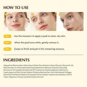 تعمل الوسادات بتركيبة هيدروجيل لطيفة تلتصق بانحناءات البشرة بسلاسة، لتمنح عناية مهدئة ومريحة مع دعم إشراقة البشرة وتوحيد مظهر لونها، كما تساعد على تقوية حاجز البشرة وتهيئتها لامتصاص أفضل لمنتجات العناية اللاحقة.