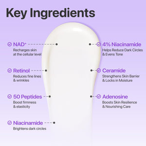 - غني بـ NAD+ والببتيدات (50 نوعًا) لدعم الشد والمرونة.