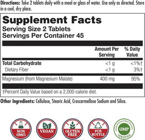 • A high-quality formula containing 400 mg of Magnesium Malate per daily dose to support vital body functions, energy, and muscle health.