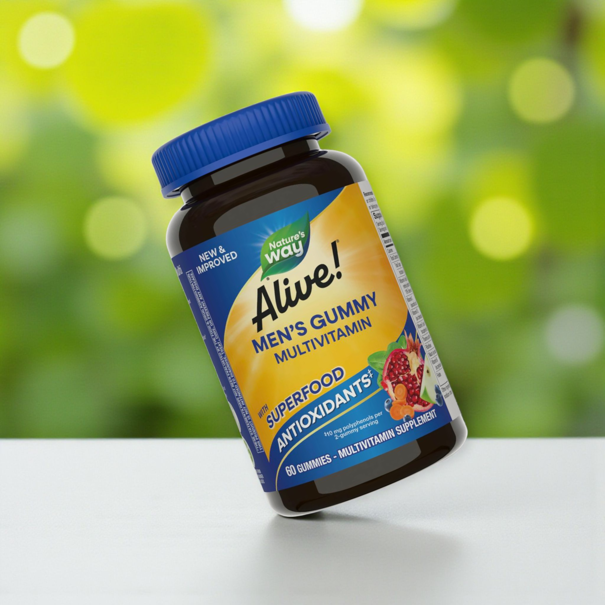Get complete nutritional support every day with Nature's Way Alive!, a supplement specially formulated for men. Rich in 15 essential vitamins and minerals , it's packed with a delicious fruity flavor and enhanced with a unique antioxidant formula derived from superfoods like pomegranate, carrot, apple, blueberry, and spinach. It's an ideal plant-based option for men looking for an easy and delicious way to support their overall health and daily energy . The supplement works to improve vital bodily functions such as immunity , heart health, and muscle health .
