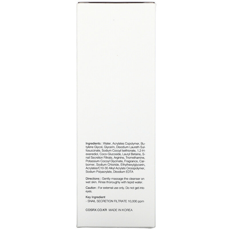- Water, Acrylates Copolymer, Butylene Glycol, Glycerin, Disodium Laureth Sulfosuccinate, Sodium Cocoyl Isethionate, 1,2-Hexanediol, Coco-Glucoside, Lauryl Betaine, Snail Secretion Filtrate, Arginine, Tromethamine, Potassium Cocoyl Glycinate, Fragrance, Carbomer, Sodium Chloride, Ethylhexylglycerin, Acrylates/C10-30 Alkyl Acrylate Crosspolymer, Sodium Polyacrylate, Disodium EDTA.