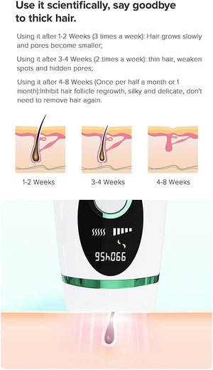 Enjoy a professional hair removal experience at home with the Intense Pulsed Light (IPL) home hair removal device , designed to gradually reduce hair growth and give you smooth, long-lasting skin. The device targets the melanin pigment in hair follicles with precise pulses of light, weakening them and halting their growth cycle. Thanks to its modern design and lightweight, it offers comfortable use on various areas of the body and face, with the ability to control energy levels to suit your needs.