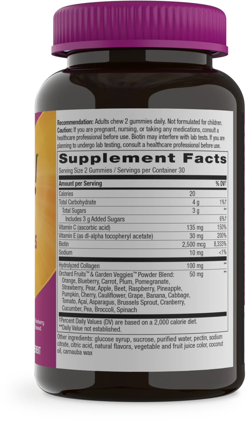 Contains natural extracts of pomegranate, blueberry, apple, carrot, spinach, and tomato, and provides the body with natural antioxidants to support healthy skin, hair, and nails.