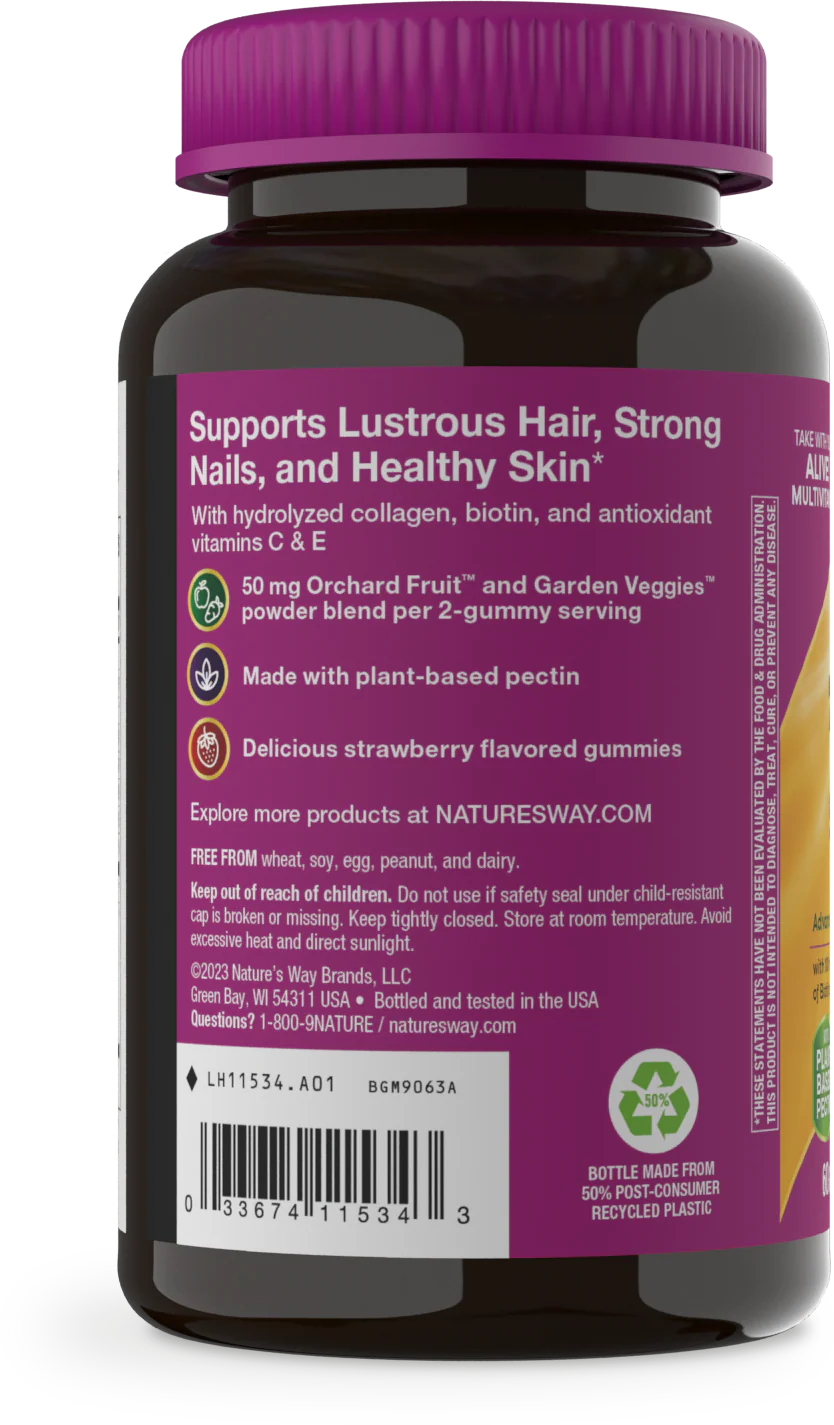 Give your hair, skin, and nails the nutritional support they deserve with Nature's Way Alive , the complete daily solution for healthy, beautiful skin from within. These naturally strawberry-flavored gummies are formulated to deliver a potent formula containing high-strength marine collagen and biotin , complemented by essential vitamins C and E and a blend of antioxidant fruits and vegetables .