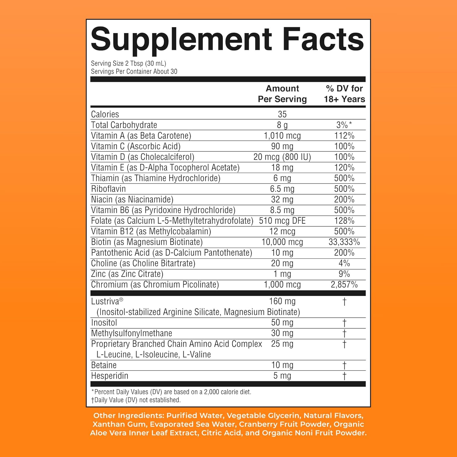 - All Ingredients: Purified Water, Vegetable Glycerin, Natural Flavors (Peach & Mango), Xanthan Gum, Evaporated Seawater, Cranberry Powder, Organic Aloe Barbadensis Leaf Extract, Citric Acid, Organic Noni Fruit Powder, Vitamin A, Vitamin C, Vitamin D3, Vitamin E, B Vitamins (B1, B2, B3, B5, B6, B7 – Biotin, B9 – Folate, B12), Zinc Citrate, Chromium Picolinate, Choline Bitartrate, Inositol, MSM (Methylsulfonylmethane), BCAA Blend (Leucine, Isoleucine, Valine), Betaine, Hesperidin, plus Lustriva® containing Magnesium Biotinate and Bonded Arginine Silicate.