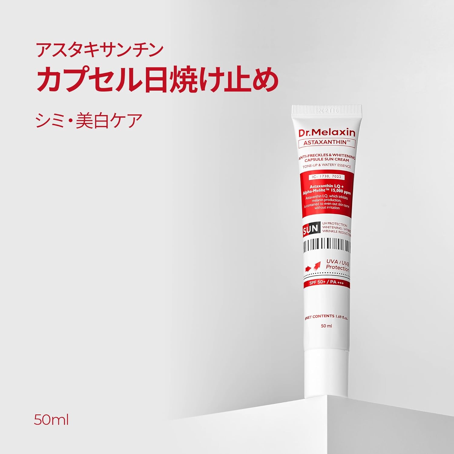 Dr. Melaxin 's Astaxanthin RX Capsule Sunscreen Cream offers advanced sun protection with SPF 50+ PA+++ and specialized care for skin prone to freckles, pigmentation, and photoaging . Its innovative formula features pink microcapsules that dissolve upon application, releasing active ingredients directly onto the skin. The light, watery texture provides a natural radiance without stickiness or a white cast . It combines UVA/UVB protection, gentle brightening, and anti-aging benefits in one daily step.