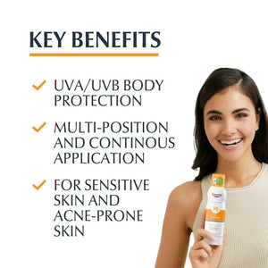Enjoy healthy, protected skin with Eucerin Dry Touch Sunscreen Spray SPF 50+ , which provides advanced protection against harmful rays without worrying about shine or sweating. Make this sunscreen part of your daily routine for smooth, protected skin all day long!