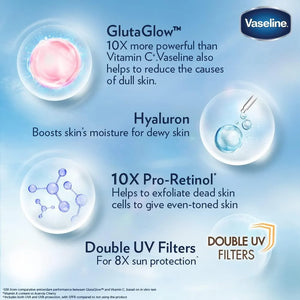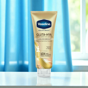 Vaseline Gluta-Hya Flawless Bright Lotion is an advanced formula designed to brighten and deeply moisturize skin, while providing effective sun protection. It contains GlutaGlow™ (10 times more powerful than Vitamin C*), plus hyaluronic acid and Pro-Retinol , making it ideal for reducing pigmentation and giving skin a healthy, even tone with every use.