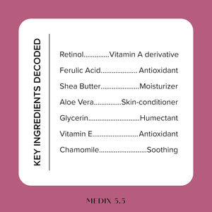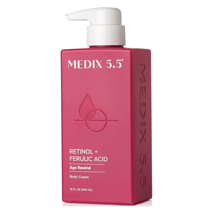 Medix 5.5 Body Cream with Retinol and Ferulic Acid is an advanced skincare cream specifically formulated to support skin renewal and improve its overall appearance. It combines retinol , one of the most popular derivatives of Vitamin A, with powerful antioxidants such as ferulic acid and green tea to help smooth aging skin , improve its elasticity, and give it a firmer, more radiant look.