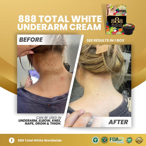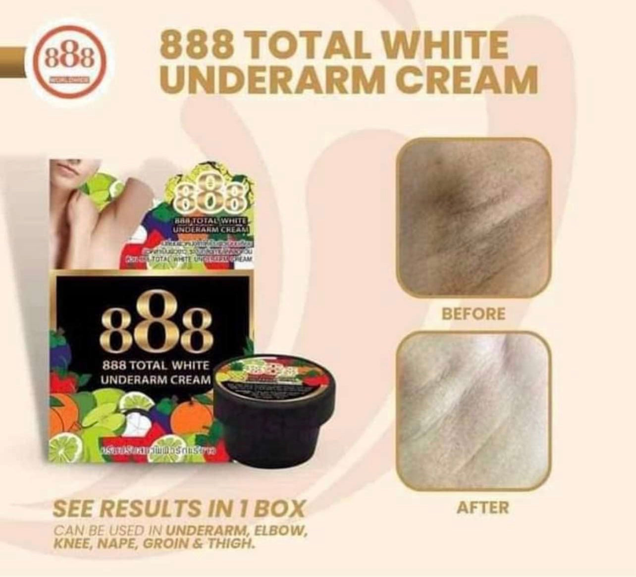 888 Total White Underarm Cream comes in a sleek black packaging with a natural fruit-inspired design, ideal for everyday use and travel. The packaging is designed to preserve product quality and facilitate application, with an airtight cap to prevent leakage and ensure hygiene.