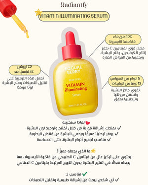 Give your skin a healthy, radiant glow with Equalberry Illuminating Serum , thanks to its unique formula enriched with 40% Acerola extract , one of the richest sources of vitamin C. The serum works to lighten visible and potential dark spots , while deeply caring for the skin barrier, hydrating it, and unifying its tone, through an innovative blend of niacinamide, arbutin, glutathione, ferulic acid, ceramides, and 8 types of hyaluronic acid .