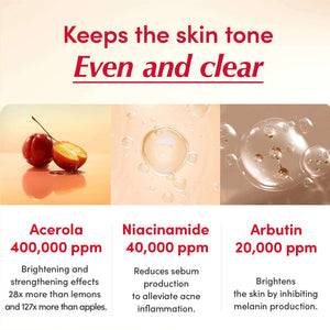 - Evens skin tone and enhances natural radiance with a powerful blend of Vitamin C, Arbutin, and Niacinamide.