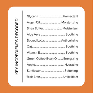 - All ingredients: Water, Cetyl Alcohol, Glycerin, Dimethicone, Ceteareth-20, Shea Butter, Argan Kernel Oil, Oat Kernel Extract, Isopropyl Myristate, Aloe Barbadensis Leaf Juice Powder, Apple Fruit Extract, Glyceryl Stearate, Cetearyl Ethylhexanoate, Cetearyl Phosphate, Coffee Seed Oil, Rapeseed Sterols, Helianthus Annuus Extract, Tocopherol, Rosmarinus Officinalis Leaf Extract, Phenoxyethanol, Xanthan Gum, Caprylyl Glycol, Parfum, Rice Bran Extract, Sodium Hydroxide, Ethylhexylglycerin, Carbomer, Hexylene Glycol, Synthetic Beeswax, Tetrasodium Glutamate Disodium acetate, Limonene, Cinnamal, Linalool.