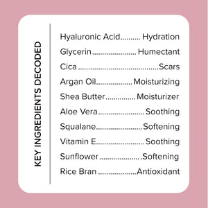 • All ingredients: Water (Aqua), Glycerin, Cetyl Alcohol, Dimethicone, Shea Butter (Butyrospermum Parkii), Ceteareth-20, Sodium Hyaluronate, Centella Asiatica Extract, Squalane, Aloe Barbadensis Leaf Juice, Helianthus Annuus Extract, Rosmarinus Officinalis Leaf Extract, Oryza Sativa Extract, Tocopherol, Isopropyl Myristate, Cetearyl Ethylhexanoate, Cetearyl Phosphate, Glyceryl Stearate, Synthetic Beeswax, Carbomer, Xanthan Gum, Phenoxyethanol, Ethylhexylglycerin, Caprylyl Glycol, Hexylene Glycol, Sodium Hydroxide, Tetrasodium Glutamate Disodium EDTA, Linalool, Benzyl Benzoate, Limonene.