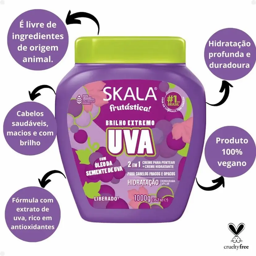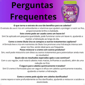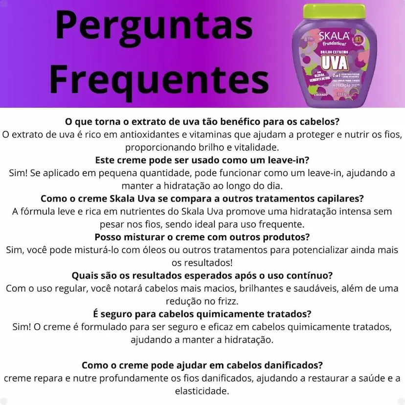 Pamper your hair with care inspired by Brazilian nature with Skala Frutas Cuca Grape Cream , which gives your hair instant hydration, striking shine, and a silky texture from the first use. Make it the secret to your daily hair beauty and enjoy a healthy look that pulsates with vitality and radiance every day.