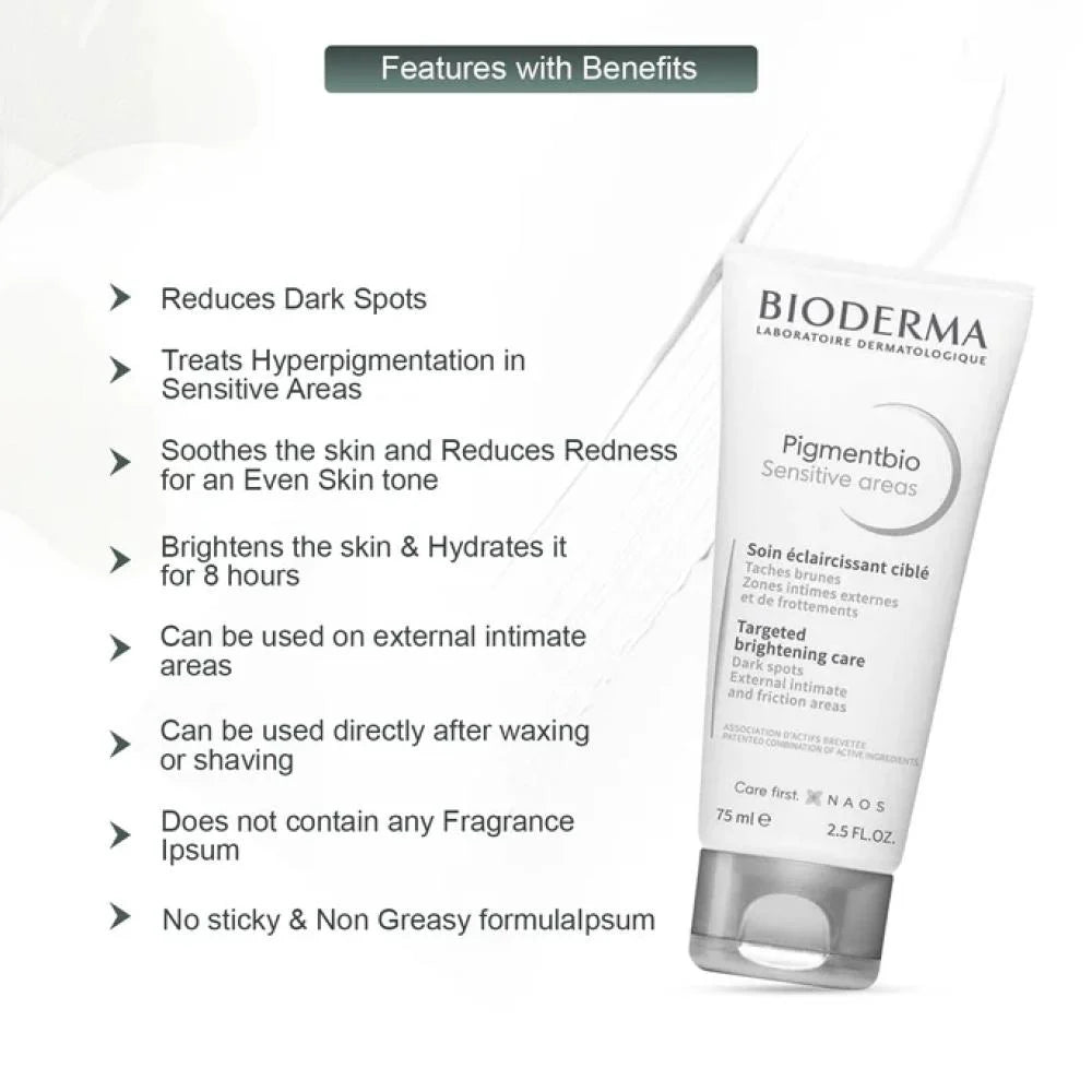 احصلي على عناية تفتيح آمنة وفعّالة للمناطق الحساسة مع Bioderma Pigmentbio Sensitive Areas، الكريم الطبي المعتمد من مختبرات بيوديرما والمتخصص في تفتيح لون البشرة وتوحيدها دون تهيّج، بفضل تقنية LumiReveal™ الحاصلة على براءة اختراع. صُمّم خصيصًا لعلاج الاسمرار الناتج عن الاحتكاك أو إزالة الشعر أو الملابس الضيقة أو التغيرات الهرمونية، مع ترطيب وتهدئة البشرة الحساسة وحمايتها من عودة التصبغ.