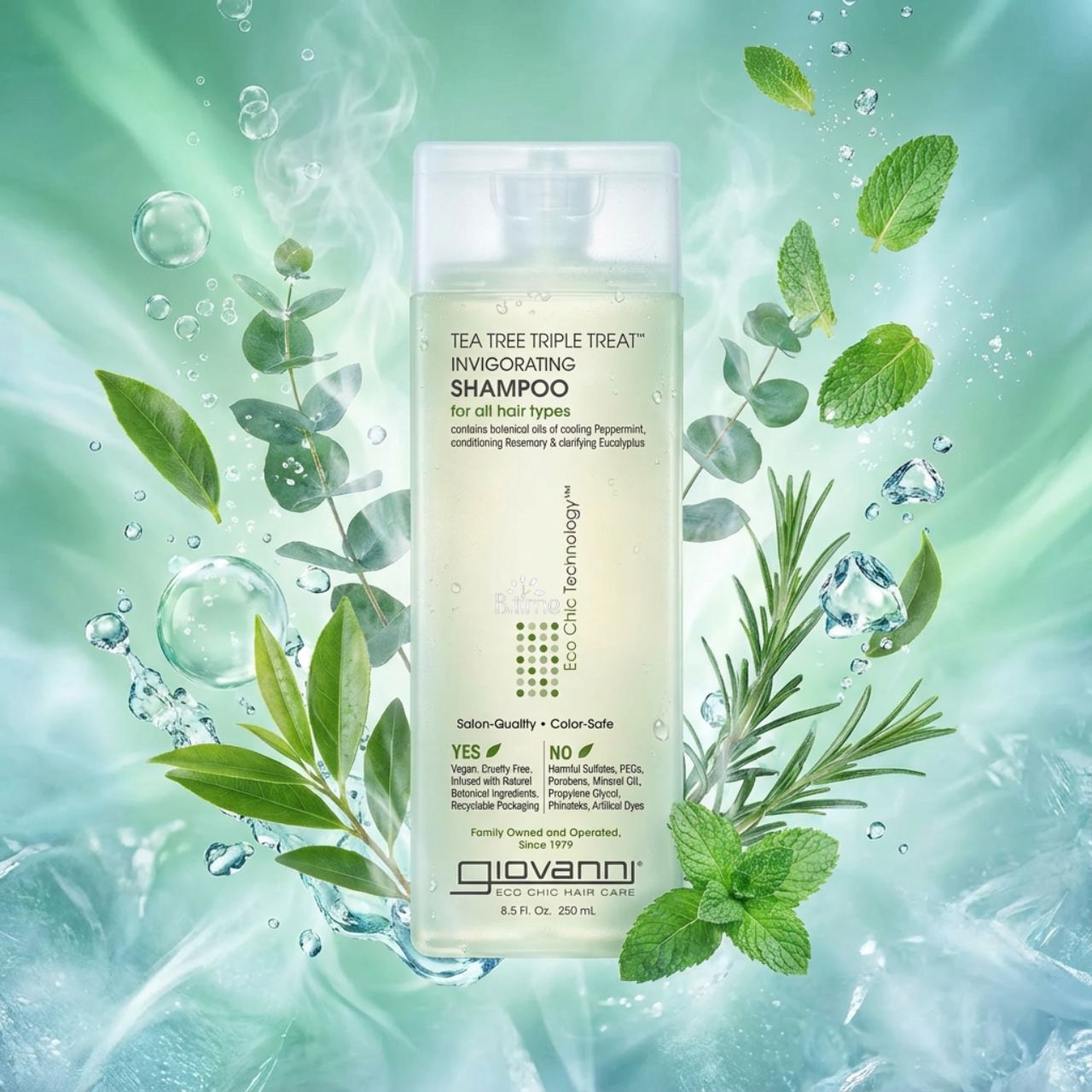 اكتشفي تجربة تنظيف وانتعاش مثالية مع شامبو تي تري تريبل تريت من جيوفاني، الذي يجمع بين قوة المكونات النباتية وتقنية Eco Chic لتمنحكِ فروة رأس نظيفة ومنتعشة وصحية وشعراً أكثر حيوية ونعومة ولمعاناً طبيعياً. مع كل غسلة، ستحصلين على إحساس دائم بالانتعاش والنظافة يعكس جمال شعركِ وصحته.